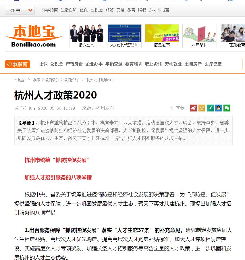 高邦杭州獵頭從杭州本地寶《杭州人才政策2020》得知,根據中央、省委關于統籌推進疫情防控和經濟社會發展的決策部署,為“抓防控、促發展”提供堅強的人才保障,進一步鞏固發展最優人才生態,聚天下英才共建杭州。現提出加強人才招引服務的八項舉措。