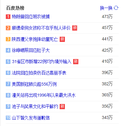 1.特朗普回應班農被捕 獵頭熱點熱度473萬