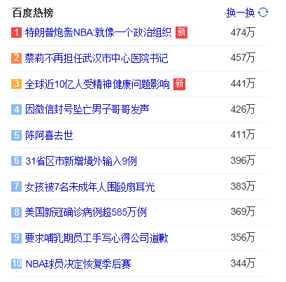 1.特朗普炮轟NBA:就像一個政治組織 獵頭熱點熱度474萬
