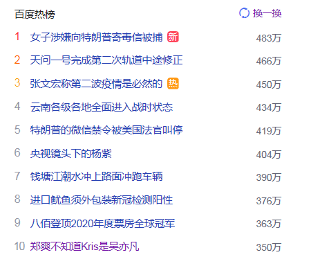 1.女子涉嫌向特朗普寄毒信被捕 獵頭熱點熱度483萬