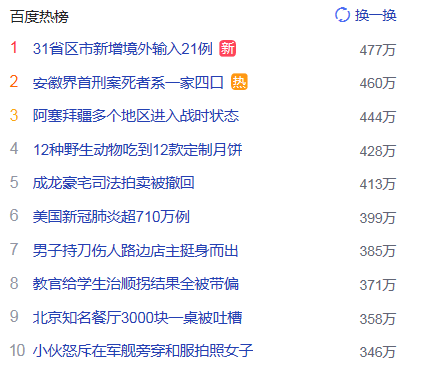 1. 31省區市新增境外輸入21例 獵頭熱點熱度477萬