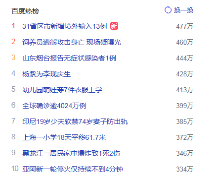 1.31省區市新增境外輸入13例 獵頭熱度熱點477萬